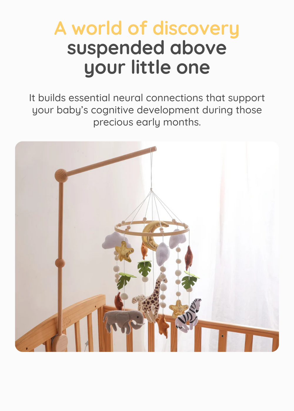 Each accessory is designed to ensure a safe and easy installation of your baby mobile. Our selection of mobile arms and the motor option allow you to adjust the height to the ideal level for your baby, providing both security and comfort while enhancing the nursery experience.