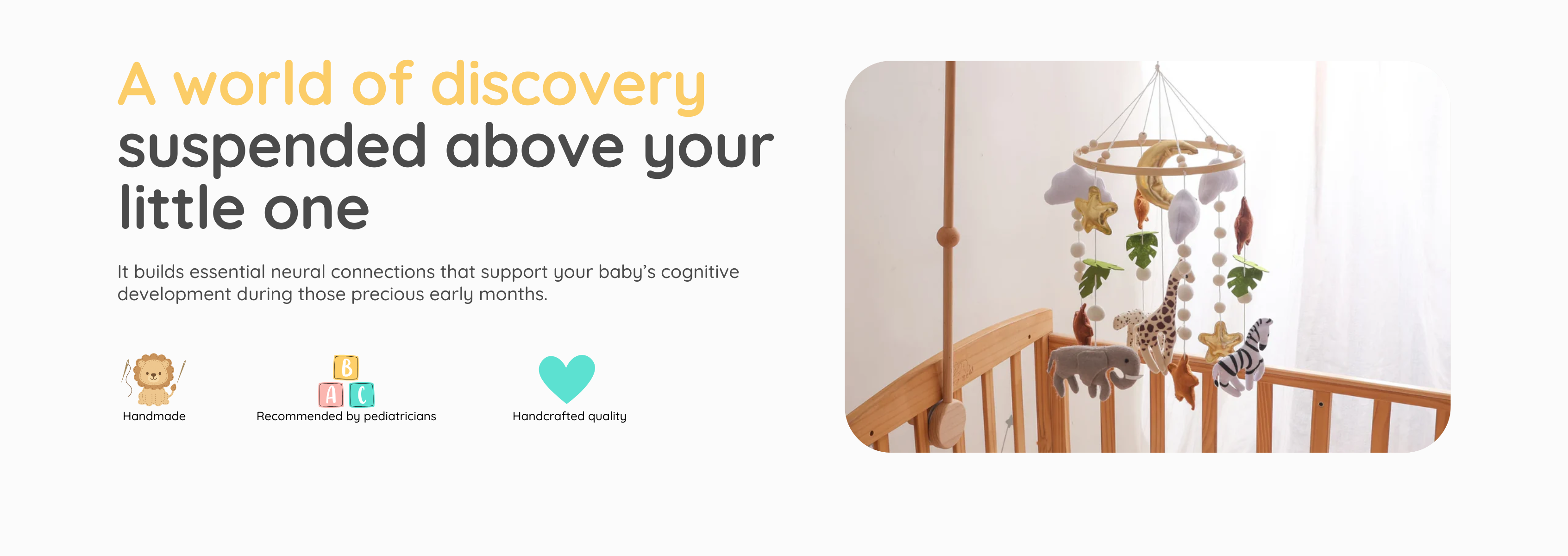 Behind every mobile we create are hours of research, design, and passion. Each mobile is built around a beechwood ring, filled with hypoallergenic stuffing and baby-safe textiles carefully chosen for their safety. The meticulous assembly, crafted by hand with precision, and create a soothing sensory world that respects your baby’s sensitivity.