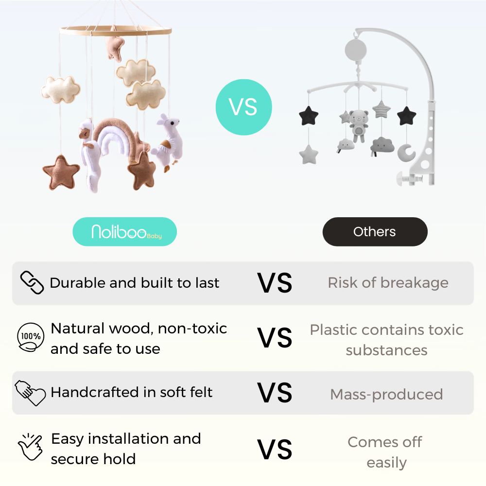 While most mobiles are often made of plastic or lower-quality materials, a Noliboobaby mobile is handcrafted in felt with meticulous details, making it soft, beautiful, and truly unique.