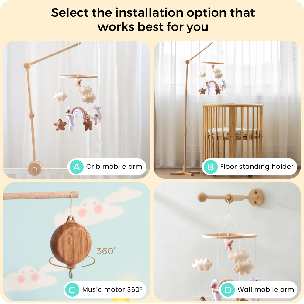 Noliboobaby mobile can be safely installed from the ceiling or paired with our natural beechwood arms (sold separately). Designed for safe and secure installation, it’s perfect for creating a soft, soothing atmosphere in your baby’s nursery.