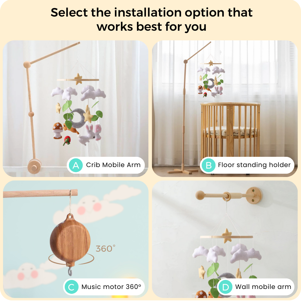 Noliboobaby mobile can be safely installed from the ceiling or paired with our natural beechwood arms (sold separately). Designed for safe and secure installation, it’s perfect for creating a soft, soothing atmosphere in your baby’s nursery.