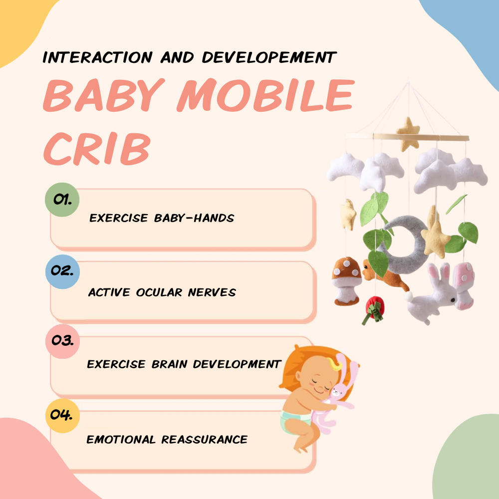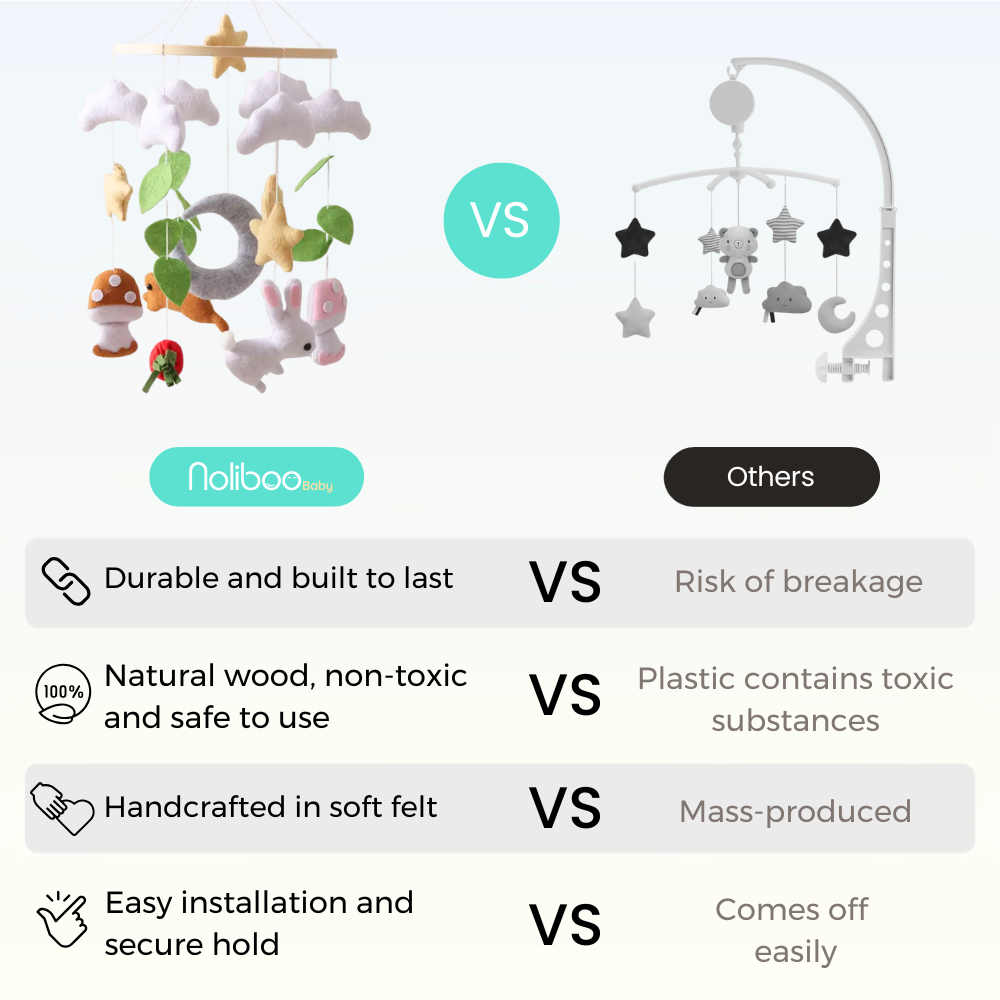 Every moment your baby spends watching the Noliboobaby mobile is a time of active learning and growth. By visually tracking the different elements, your baby strengthens eye muscles and develops spatial awareness, skills that will later support crawling, walking and even reading.