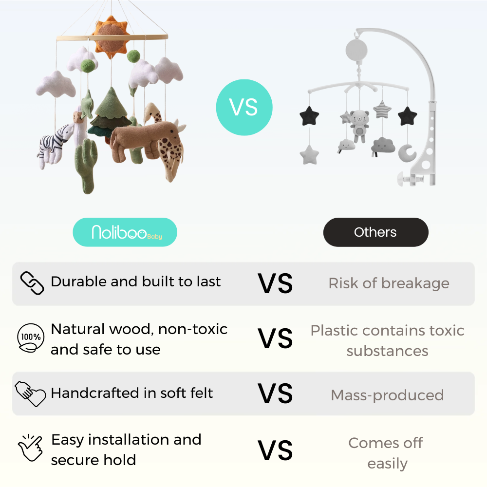 While most mobiles are often made of plastic or lower-quality materials, a Noliboobaby mobile is handcrafted in felt with meticulous details, making it soft, beautiful, and truly unique.