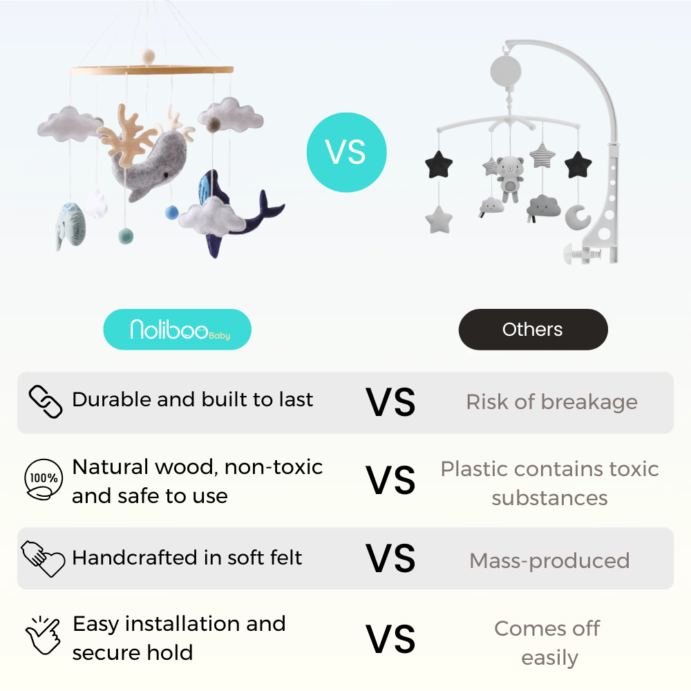 While most mobiles are often made of plastic or lower-quality materials, a Noliboobaby mobile is handcrafted in felt with meticulous details, making it soft, beautiful, and truly unique.