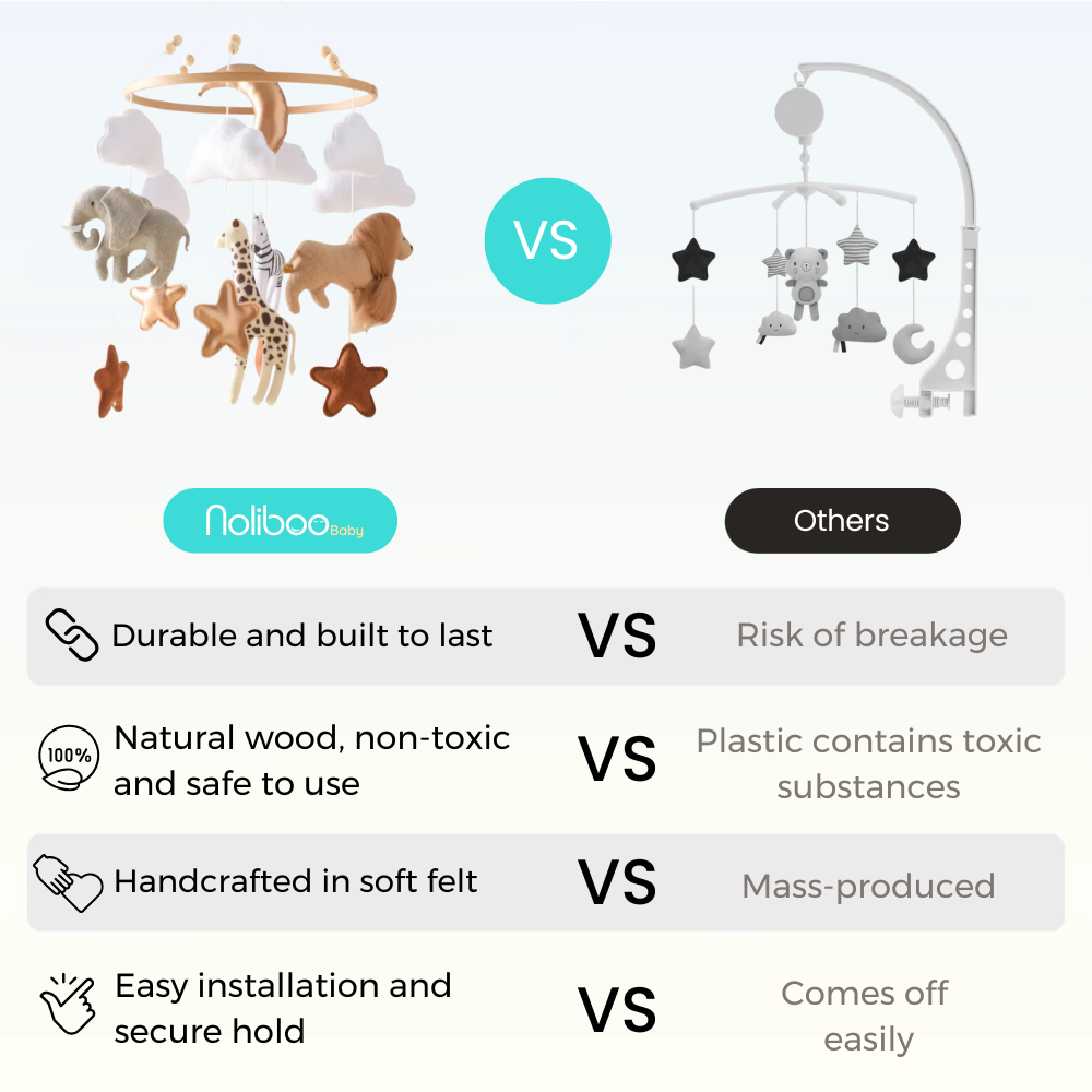 While most mobiles are often made of plastic or lower-quality materials, a Noliboobaby mobile is handcrafted in felt with meticulous details, making it soft, beautiful, and truly unique.