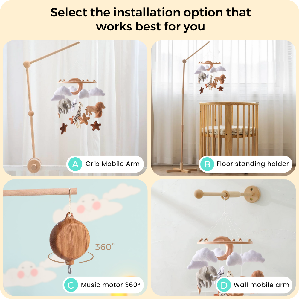 Noliboobaby mobile can be safely installed from the ceiling or paired with our natural beechwood arms (sold separately). Designed for safe and secure installation, it’s perfect for creating a soft, soothing atmosphere in your baby’s nursery.