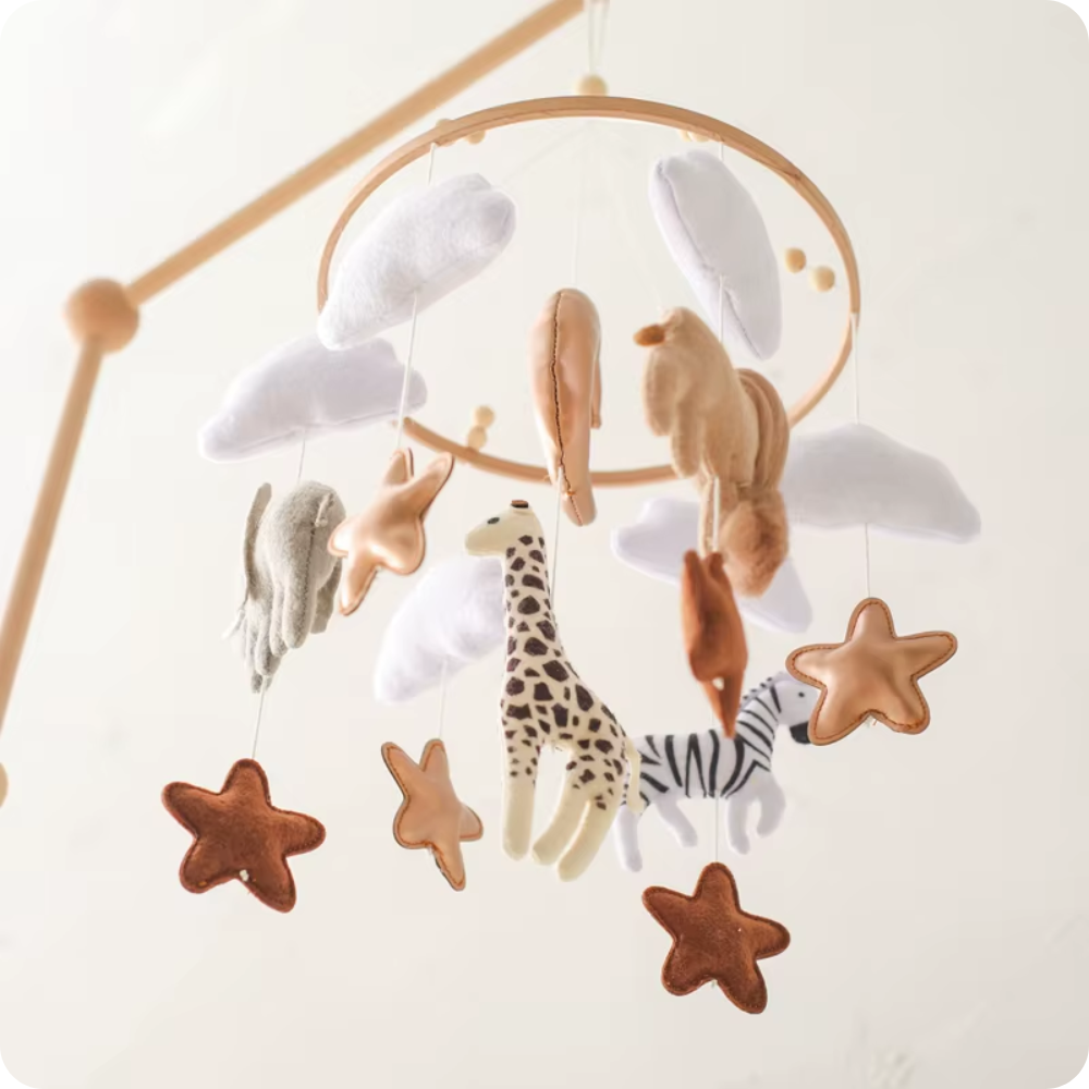 Every moment your baby spends watching the Noliboobaby mobile is a time of active learning and growth. By visually tracking the different elements, your baby strengthens eye muscles and develops spatial awareness, skills that will later support crawling, walking and even reading.