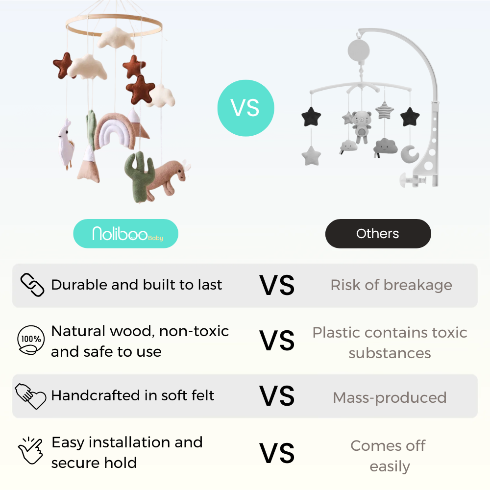While most mobiles are often made of plastic or lower-quality materials, a Noliboobaby mobile is handcrafted in felt with meticulous details, making it soft, beautiful, and truly unique.