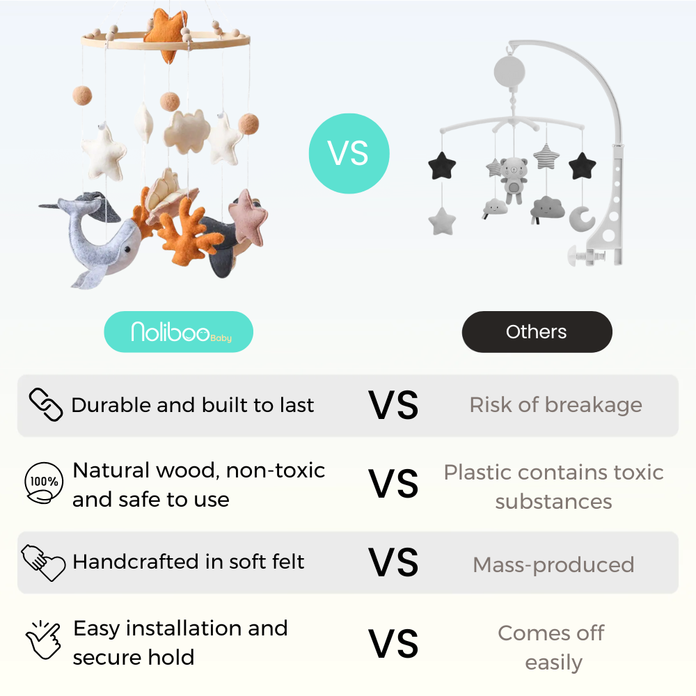 While most mobiles are often made of plastic or lower-quality materials, a Noliboobaby mobile is handcrafted in felt with meticulous details, making it soft, beautiful, and truly unique.
