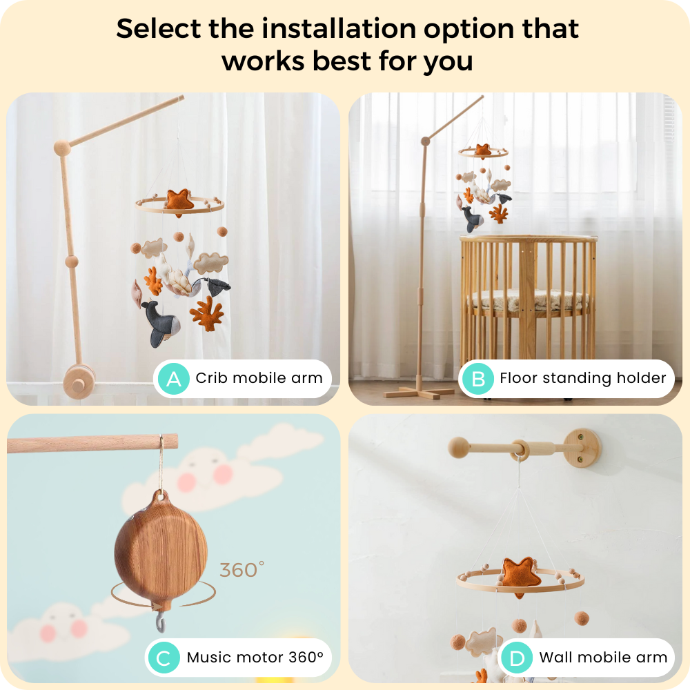 Noliboobaby mobile can be safely installed from the ceiling or paired with our natural beechwood arms (sold separately). Designed for safe and secure installation, it’s perfect for creating a soft, soothing atmosphere in your baby’s nursery.