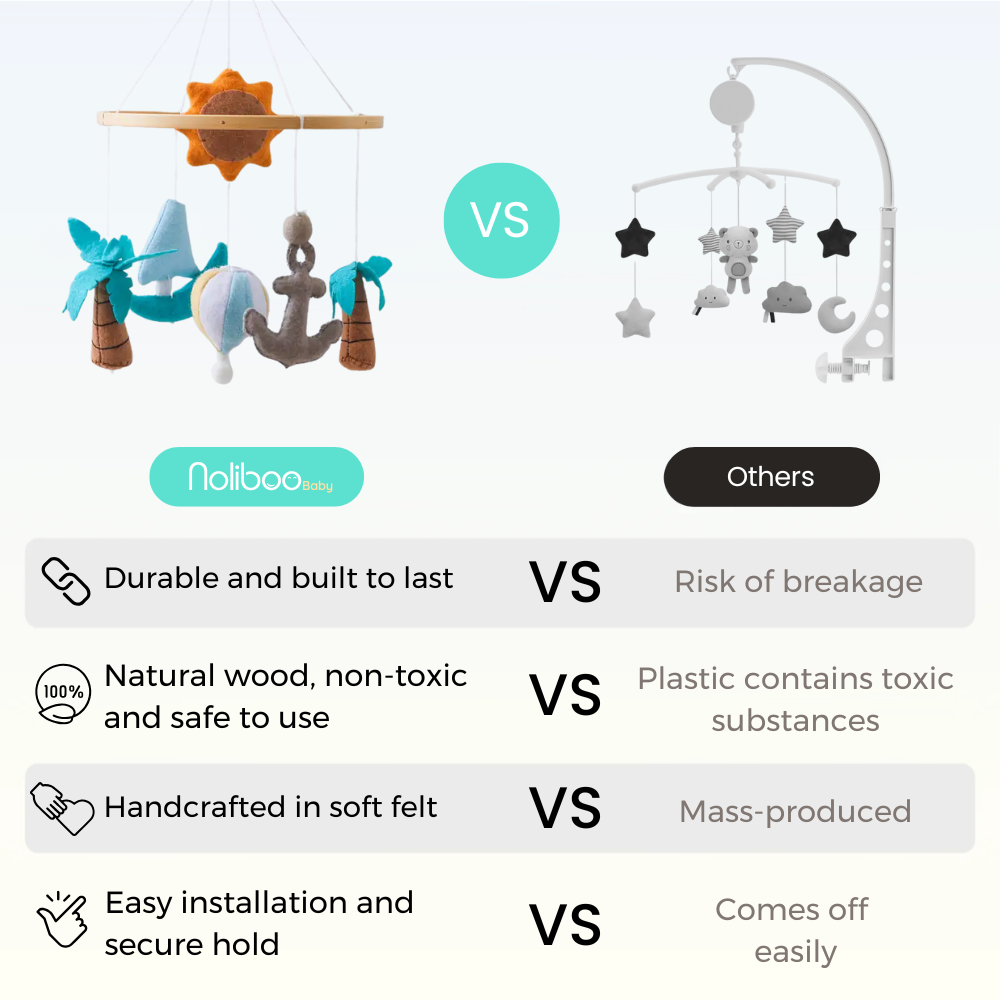 While most mobiles are often made of plastic or lower-quality materials, a Noliboobaby mobile is handcrafted in felt with meticulous details, making it soft, beautiful, and truly unique.