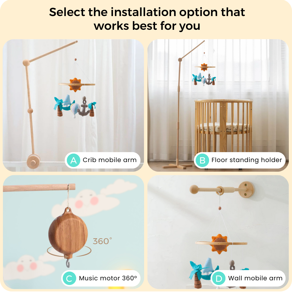 Noliboobaby mobile can be safely installed from the ceiling or paired with our natural beechwood arms (sold separately). Designed for safe and secure installation, it’s perfect for creating a soft, soothing atmosphere in your baby’s nursery.
