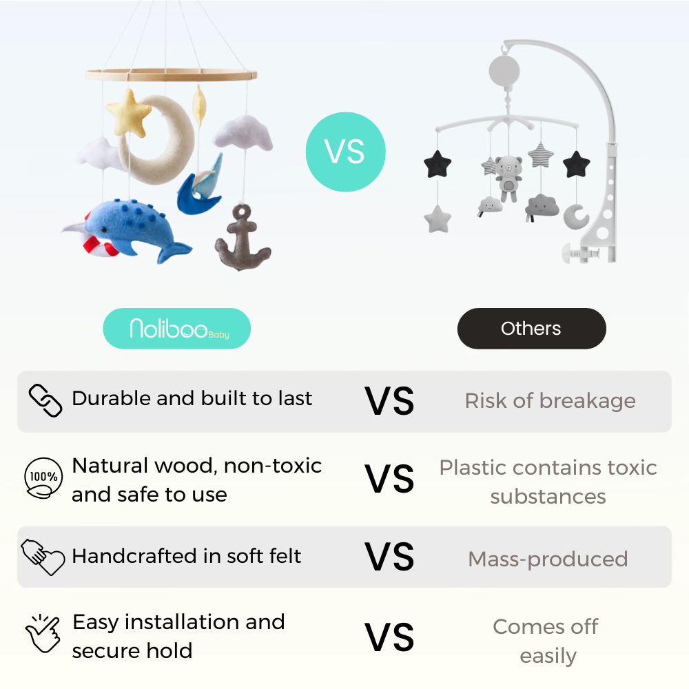 While most mobiles are often made of plastic or lower-quality materials, a Noliboobaby mobile is handcrafted in felt with meticulous details, making it soft, beautiful, and truly unique.