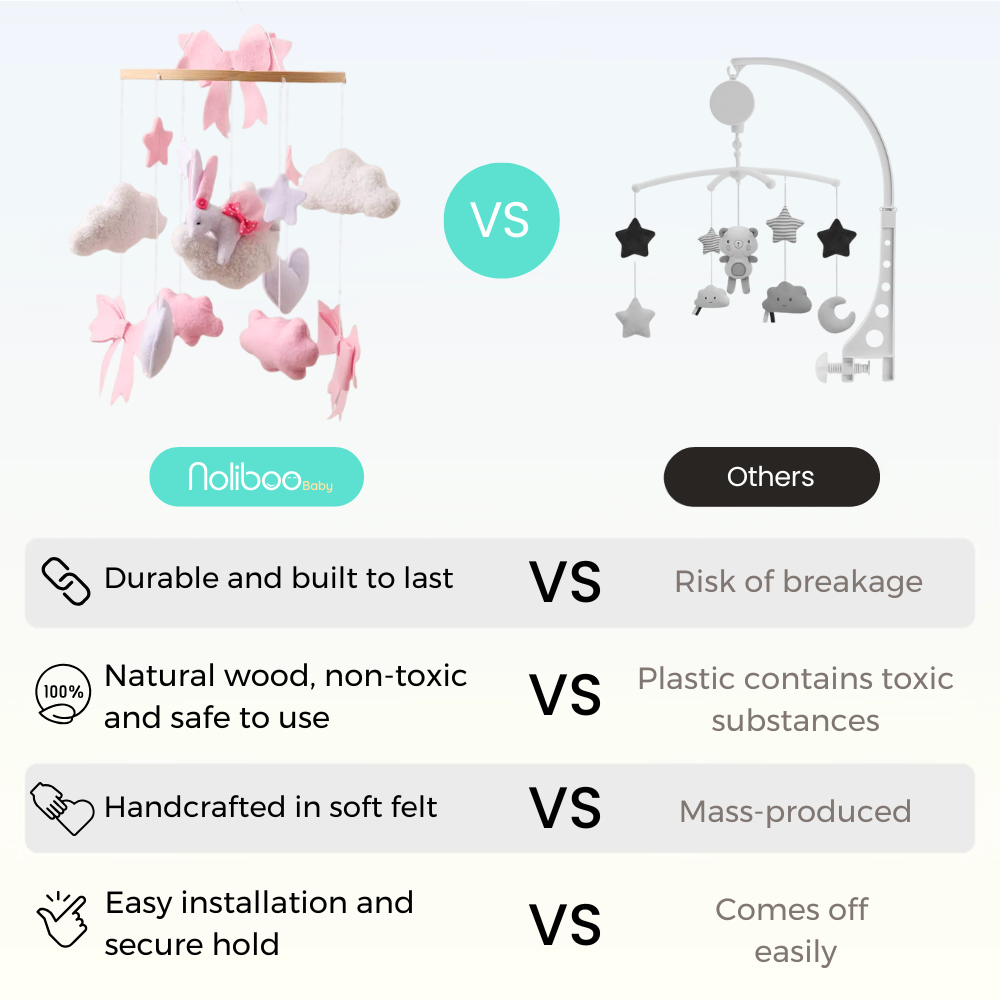 Every moment your baby spends watching the Noliboobaby mobile is a time of active learning and growth. By visually tracking the different elements, your baby strengthens eye muscles and develops spatial awareness, skills that will later support crawling, walking and even reading.