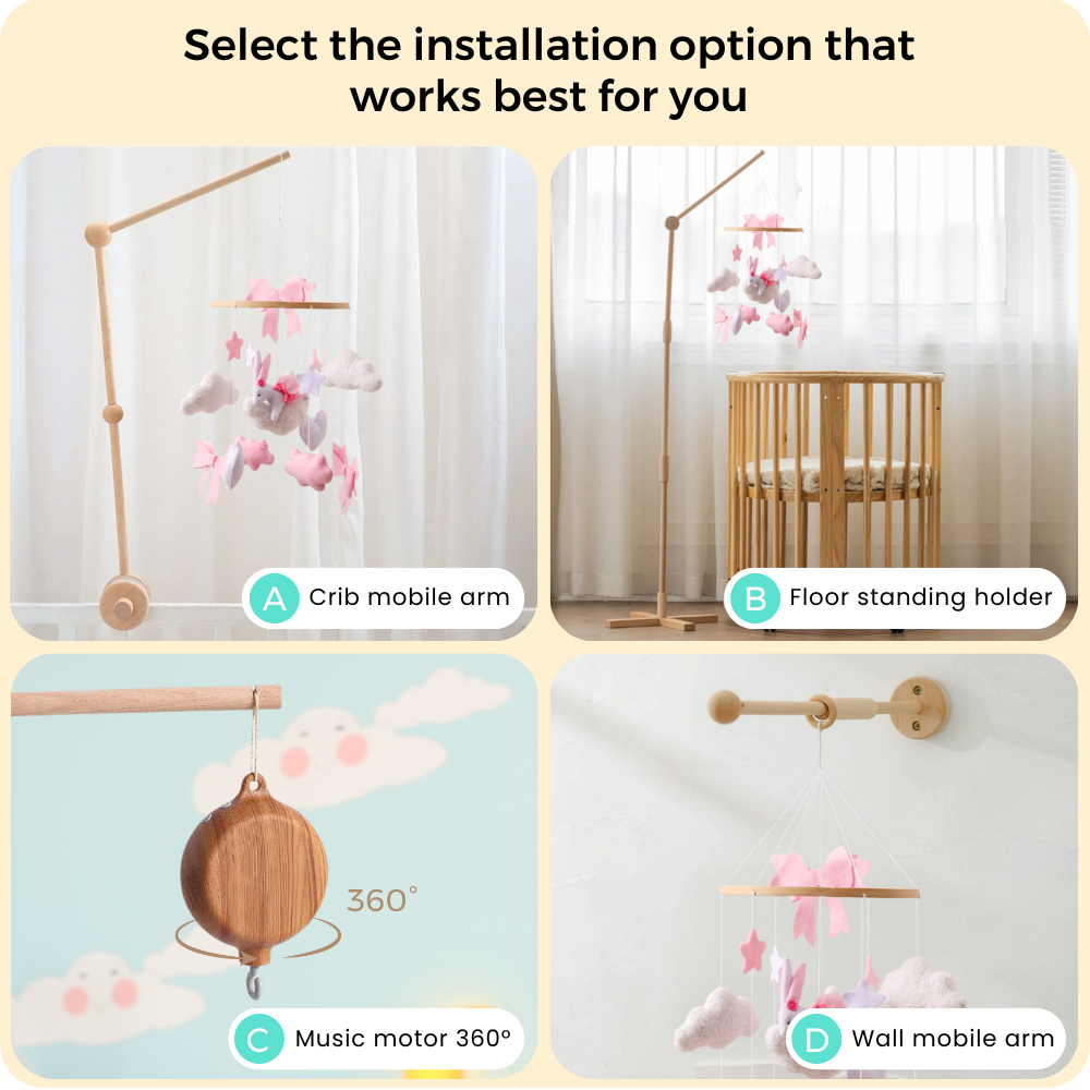 Noliboobaby mobile can be safely installed from the ceiling or paired with our natural beechwood arms (sold separately). Designed for safe and secure installation, it’s perfect for creating a soft, soothing atmosphere in your baby’s nursery.